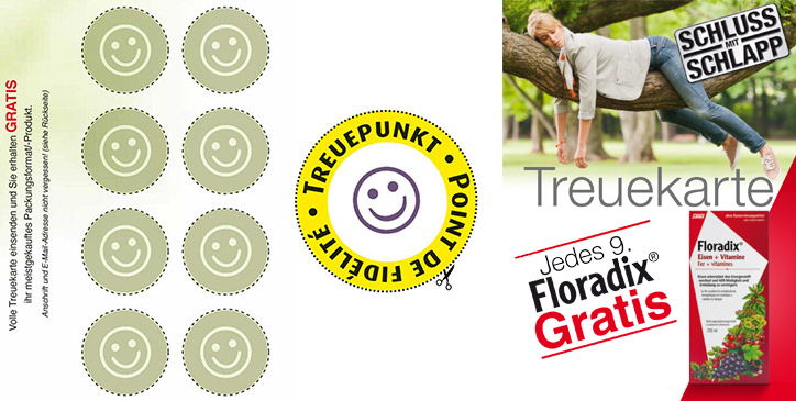 Hier die Treuekarte runterladen, ausdrucken und die volle Treuekarte einsenden. Sie erhalten dann GRATIS Ihr bevorzugtes Floradix-Produkt. Treuekarte